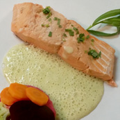 Biolachs gebraten mit Vanillebutter, Karottenroyal